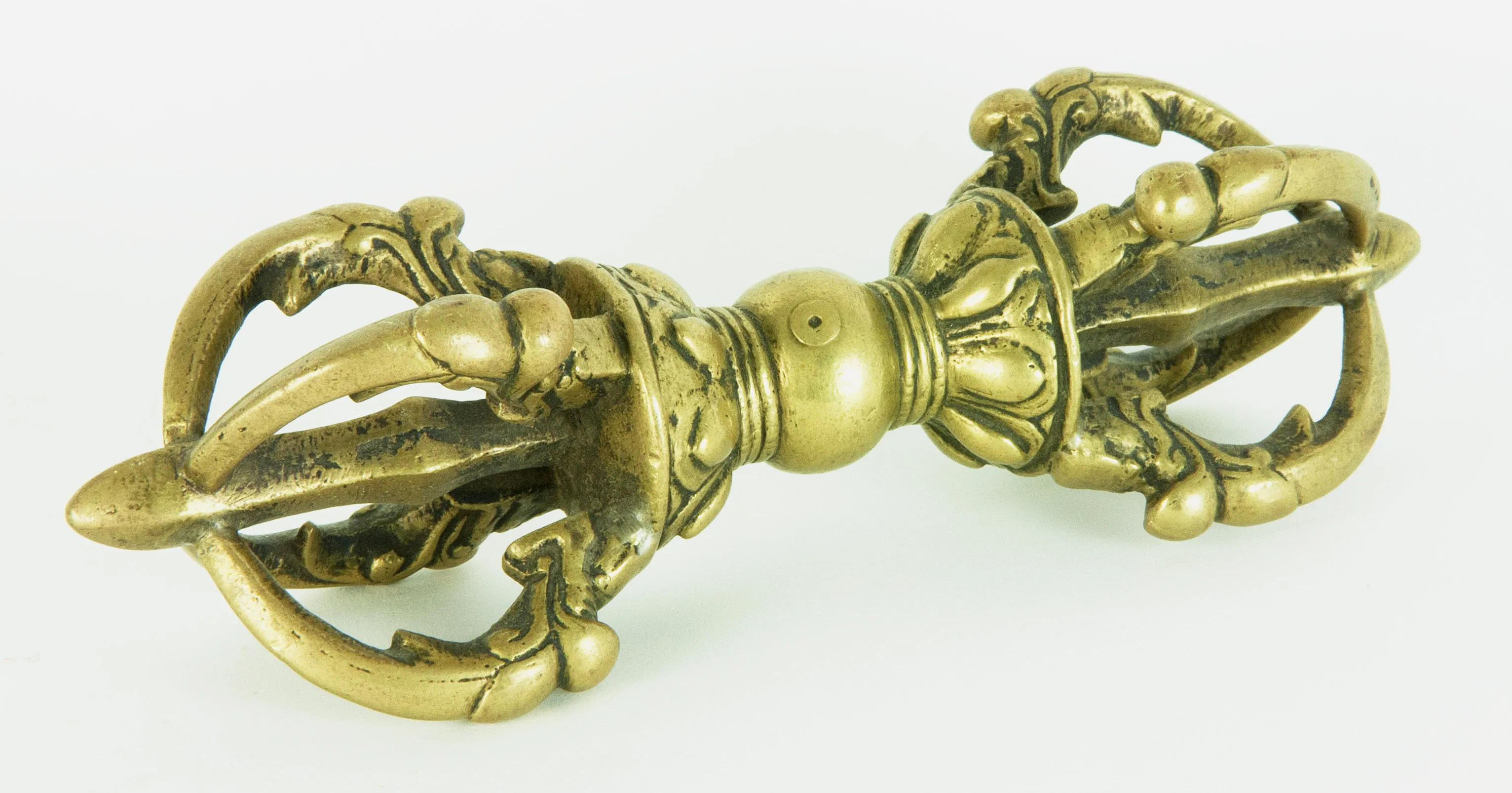 Il Vajra (in tibetano Dorje) in bronzo dorato rappresenta lo strumento rituale per eccellenza del Buddhismo Vajrayana, letteralmente il “Veicolo del Diamante” o della “Folgore”. Insieme alla campana (Ghanta), il Vajra costituisce la coppia liturgica fondamentale: se la campana rappresenta la saggezza (femminile), il Vajra simboleggia il metodo e la compassione (maschile). La sua struttura ‘a diamante’ indica ciò che è indistruttibile e immutabile.