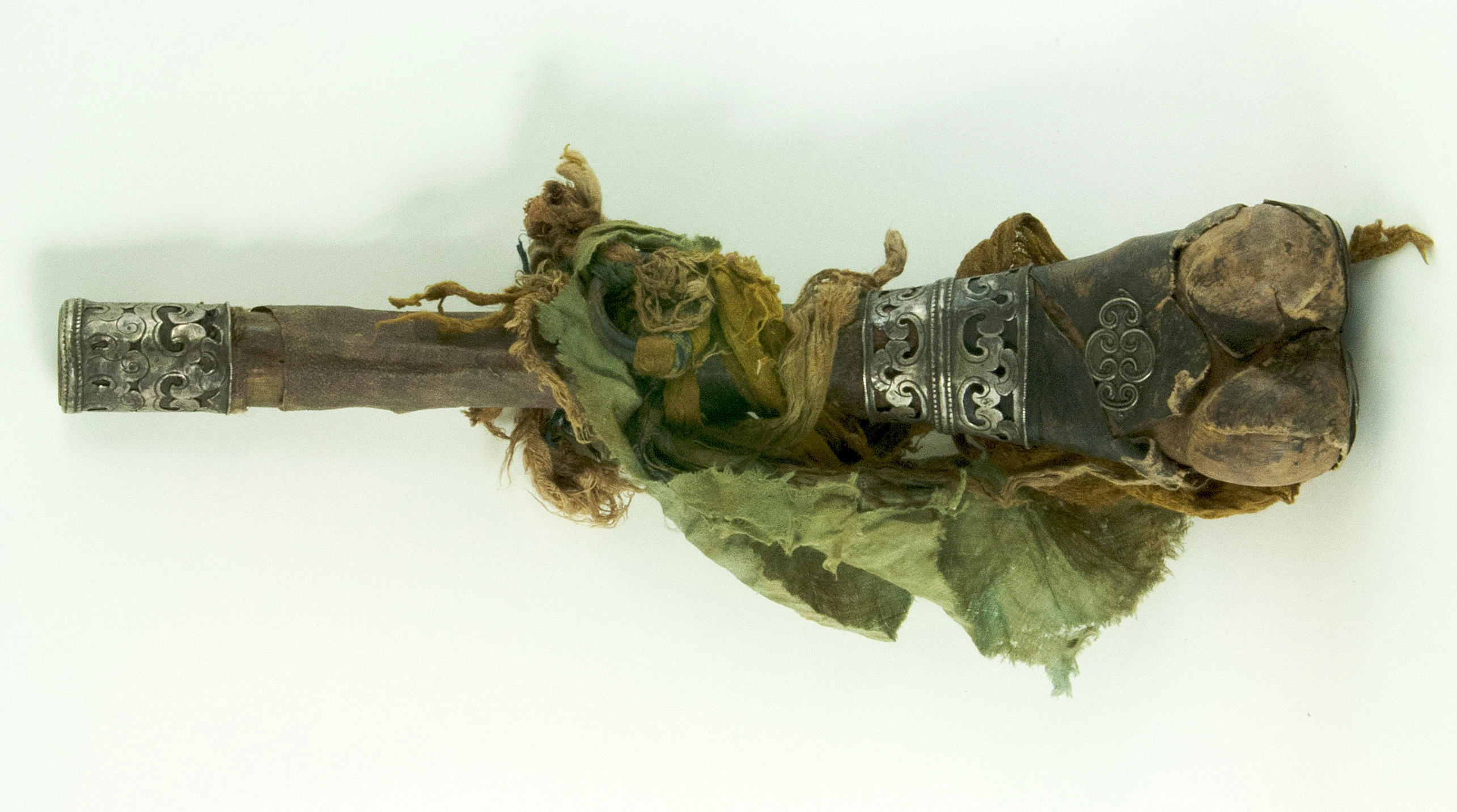 Lo strumento è ricavato da un femore meticolosamente lavorato. La parte terminale mostra i due condili dell’osso che fungono da cassa di risonanza naturale, parzialmente rivestiti in pelle per attutire e sigillare la struttura. Il fusto è avvolto in cuoio scuro, una tecnica che serve a prevenire le crepe nell’osso dovute alle variazioni di umidità e a migliorare l’impugnatura durante i lunghi rituali. Sono presenti due ampie fasce in metallo bianco (probabilmente argento o una lega argentata) finemente lavorate a sbalzo e traforo con motivi di nuvole stilizzate e volute vegetali; questi elementi non solo rinforzano le giunzioni ma elevano l’osso da reperto anatomico a oggetto liturgico prezioso. Un’estremità superiore presenta un inserto in tessuto rosso, tradizionalmente associato alla vitalità e alla protezione, che funge da protezione per l’imboccatura o come elemento decorativo cerimoniale.