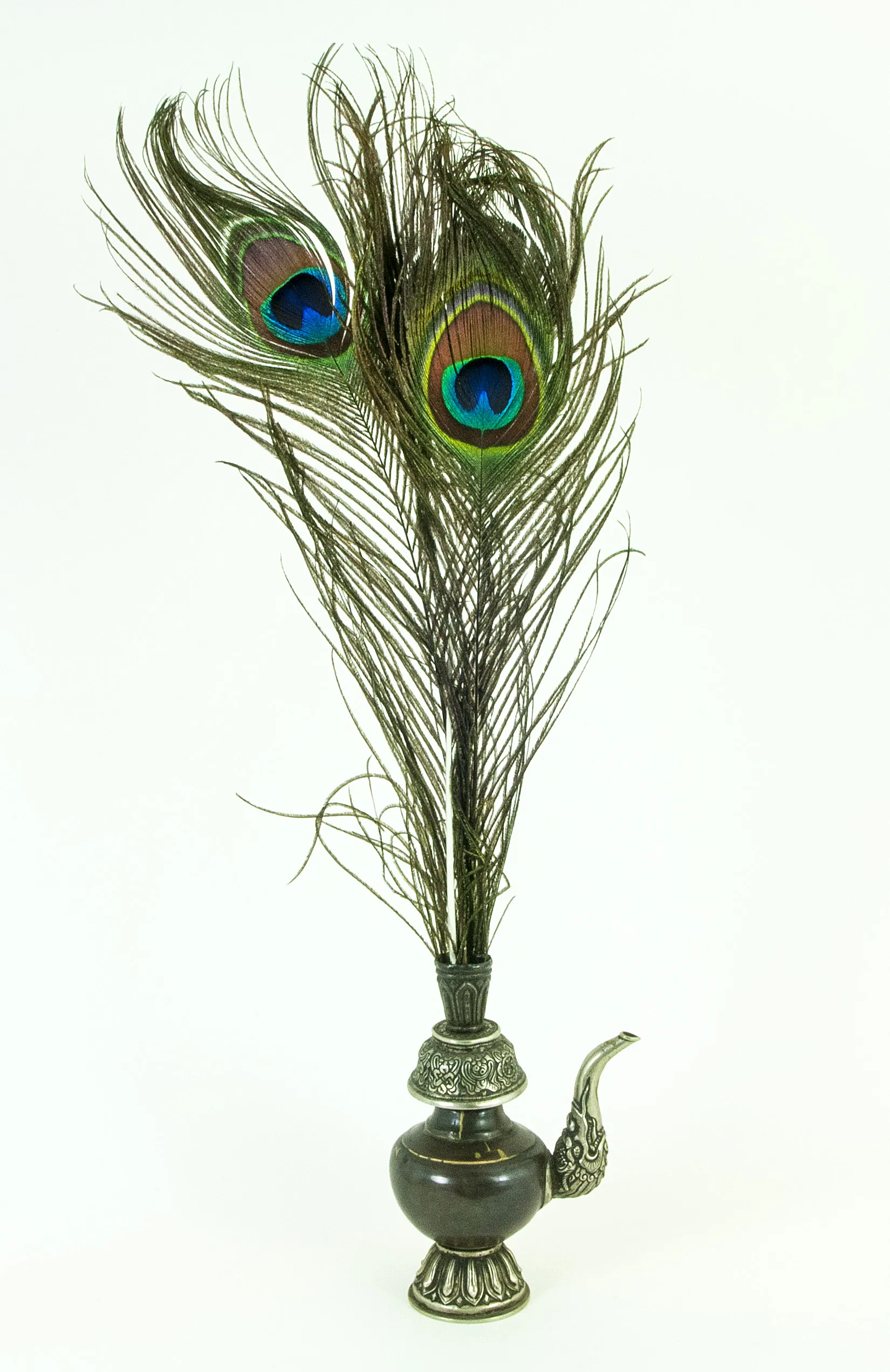 Nelle cerimonie del “Rituale della Longevità” chiamate Tshe-wang, il Lama tocca la testa dei fedeli con la base di un vaso simile a questo per trasmettere l’energia della lunga vita. Il vaso è progettato per contenere l’Arshaan (il nettare), che è la versione mongola dell’Amrita, l’elisir d’immortalità che il Buddha Amitayus tiene nel suo vaso della longevità. La forma panciuta del corpo in rame rappresenta il grembo dell’universo che custodisce i tesori inesauribili, tra cui la vita stessa. Le decorazioni in argento sbalzato con motivi a loto e il beccuccio a Makara servono a “sigillare” la purezza del nettare all’interno, impedendo che le forze della decadenza e della morte precoce possano contaminarlo. Le piume di pavone (Khuru) sono il simbolo della trasformazione dei “veleni” (ciò che accorcia la vita, come l’odio e l’ignoranza) in saggezza e vitalità.