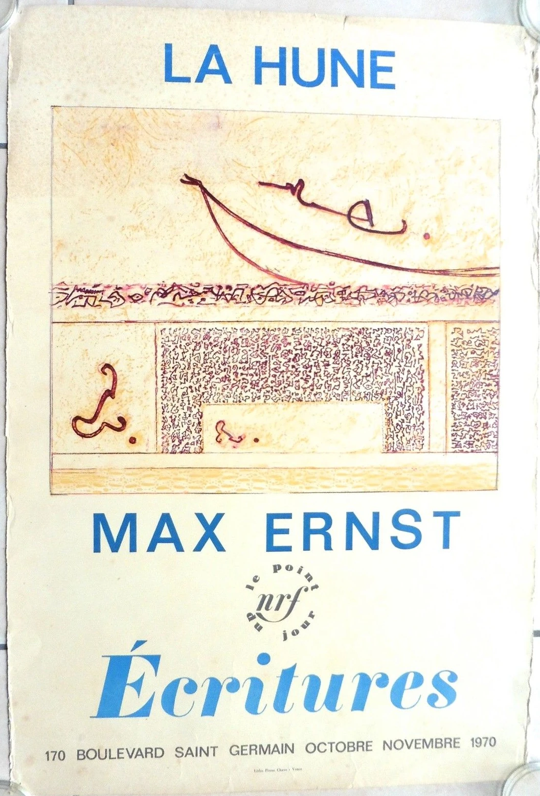 - Manifesto originale su carta opaca non firmato e non numerato, relativo alla mostra di Max Ernst "Écritures" alla Galleria La Hune di Parigi / Stampato da Pierre Chave
