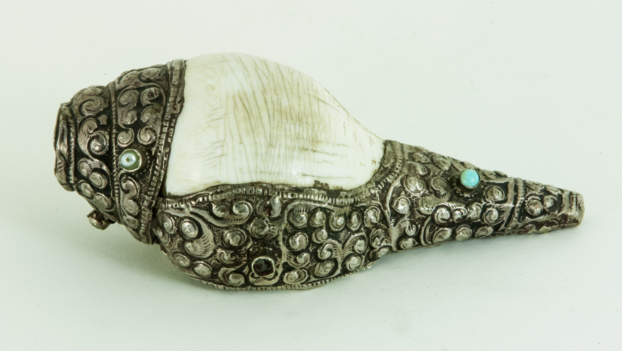 Si tratta del guscio di un gasteropode marino, scientificamente noto come Turbinella pyrum, proveniente dall’Oceano Indiano. Il fatto che si trovi in Mongolia testimonia le vaste reti commerciali che rifornivano i monasteri della steppa. La conchiglia è uno degli Ashtamangala (gli Otto Simboli di Buon Auspicio): rappresenta il suono pervasivo del Buddha che si diffonde in ogni direzione, risvegliando gli esseri dall’ignoranza.