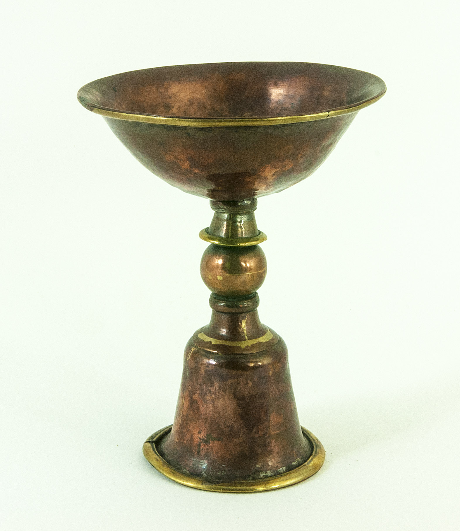 Il corpo della lampada è realizzato in rame battuto, un materiale scelto per la sua resistenza e per la capacità di riflettere calore, mantenendo il burro di yak allo stato liquido durante le lunghe preghiere. I bordi superiori e le giunzioni del fusto sono rifiniti in ottone dorato, creando un contrasto cromatico che eleva la dignità dell’oggetto. La parte centrale del supporto presenta una protuberanza globulare (simile a un vaso Bum-pa) che funge da impugnatura sicura e da elemento di equilibrio estetico tra l’ampia base a campana e la coppa superiore.