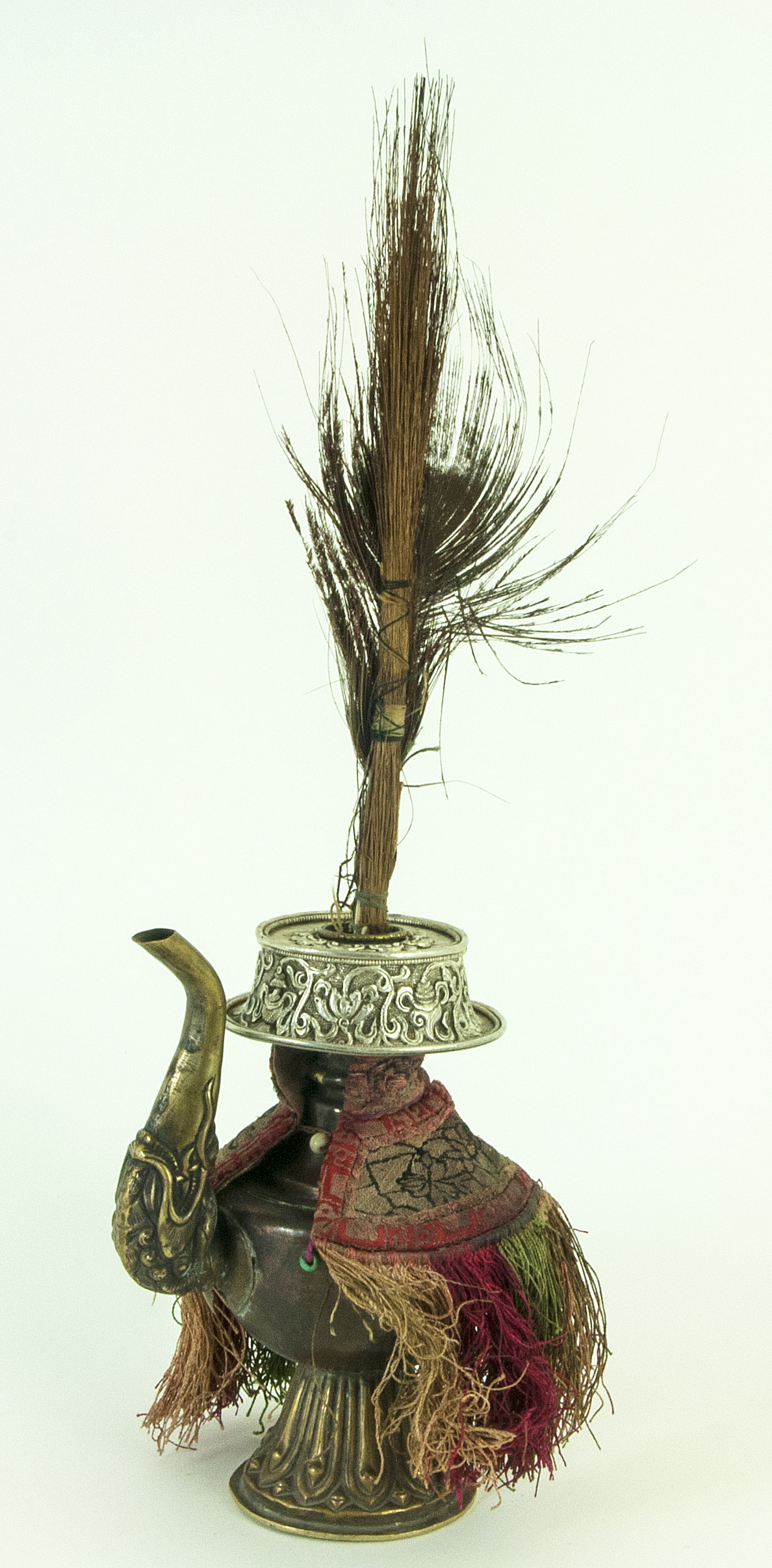 Questo particolare esemplare è “vestito” da un panno di broccato rosso e frange policrome (verde, giallo e bordeaux): ciò indica che l’oggetto è stato formalmente consacrato. Nella tradizione mongola, coprire il vaso serve a proteggere l’Arshaan (nettare) dalla vista dei non iniziati e a simboleggiare il corpo regale della divinità della lunga vita.