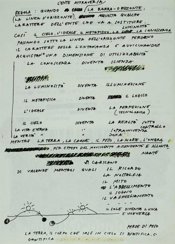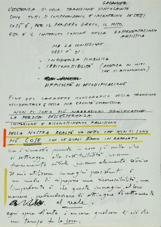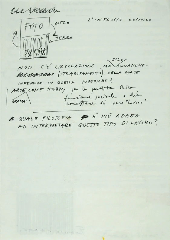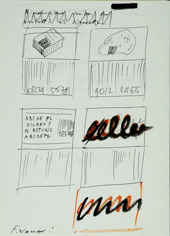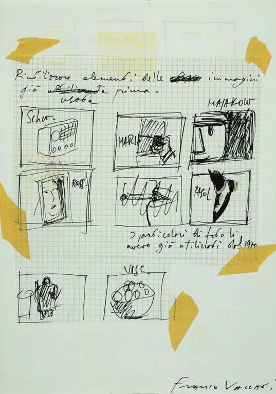 Si tratta di un taccuino Pigna ad anelli (cm 29.5 × 22) composto da n. 21 fogli di schizzi a pennarello e/o pastello, talvolta collage, con annotazioni e appunti.
