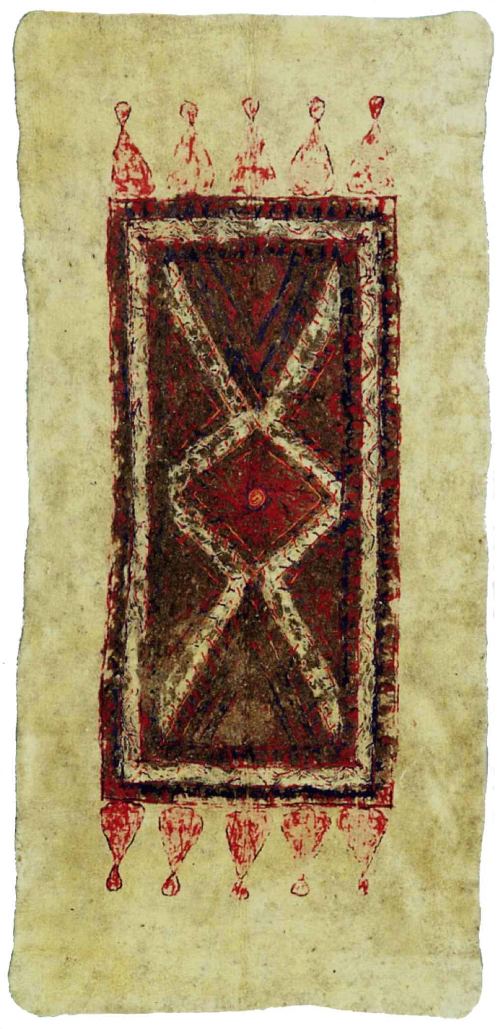La decorazione svolgeva un ruolo strutturale e simbolico. I motivi geometrici non erano meri elementi ornamentali ma segni codificati, riconoscibili all’interno delle tradizioni familiari e tribali. Alcune forme richiamano schemi protettivi di lunga durata — triangoli, assi oblique, rombi — associati alla tutela degli abitanti della tenda e del loro patrimonio. Altre configurazioni rimandano a una dimensione identitaria, indicando l’appartenenza a un gruppo, a un territorio o a una specifica tradizione artigianale.