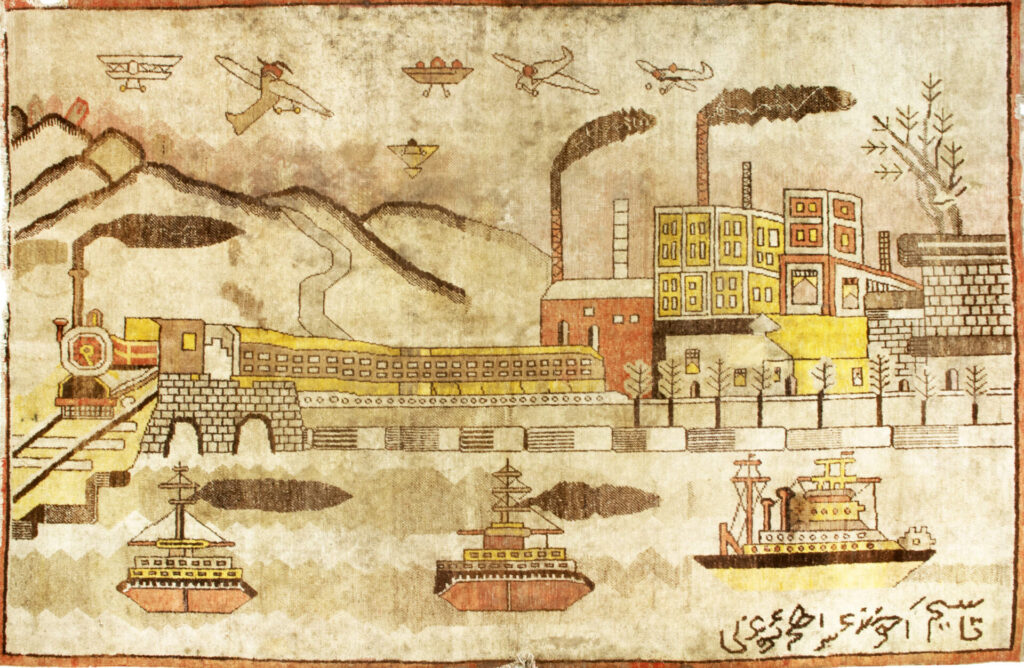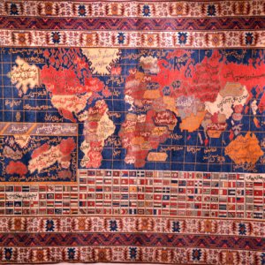 Attingendo alla collezione di duecento esemplari di tappeti figurati orientali (dal fondo di dotazione della Fondazione Sergio Poggianella), si è inteso allestire un percorso che fosse in grado di documentare le numerose varianti dei cosiddetti war rug, i tappeti di guerra afghani, ponendone in evidenza le questioni e le prospettive di ricerca. Prevalentemente annodati e più raramente tessuti o ricamati, questi sono realizzati per la gran parte in Afghanistan (ma anche in Pakistan, alla cui frontiera nord-ovest si erano stanziate le nuove manifatture dei profughi afghani, o in Iran dove ancora oggi si contano circa tre milioni di rifugiati afghani), oltre che in Asia Centrale e in Cina. Tra i loro soggetti, rappresentazioni geografiche del mondo e della regione afghana che vanno da veri e propri planisferi arricchiti dal catalogo delle bandiere degli Stati, alle carte politiche e tematiche, al paesaggio, al ritratto dei personaggi pubblici; con o senza le “armi”. Sono manufatti che hanno goduto della massima fortuna, ovvero di un significativo interesse commerciale, nel periodo compreso tra l’invasione sovietica dell’Afghanistan (1979-1989) e la missione Enduring Freedom (2001-2006), ben oltre i confini dello stesso Afghanistan. La loro origine rimane però ancora tutta da indagare, costituendo tale produzione un esempio di drastica rottura con la tradizione del tappeto orientale; basti pensare che già negli anni Venti, nel vicino Khotan, nella trama dei tappeti si insidiavano i primi segni della rivoluzione modernista, comparendo nei paesaggi urbani i treni in velocità, le navi a vapore e gli aeromobili.