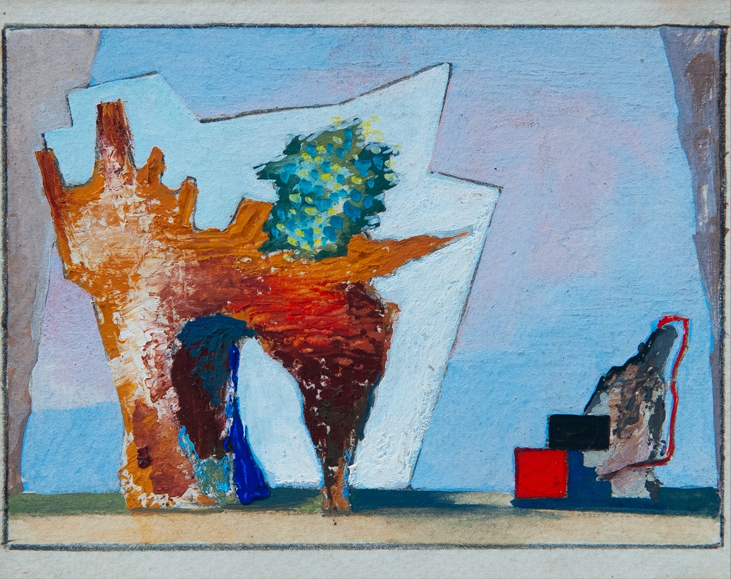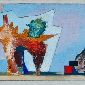 Il fondo che qui presentiamo, di cui fanno parte in prevalenza i disegni dalle pagine dei taccuini di piccole dimensioni insieme ad alcune opere di grande formato, con alcuni inediti, sono una sorta di “zibaldone” che di Prampolini restituisce gli interessi e le pratiche della sua arte: dalla tempera de La ruota del 1915 e dal bozzetto di una Coreografia di Isadora Duncan del 1926; passando per i bozzetti delle copertine di riviste degli anni Quaranta; o dell’olio su tavola con Figura al mare del 1945 che si accende dei colori dei soggiorni capresi; fino alle grandi composizioni astratte polimateriche degli anni Cinquanta con Apparizione Cosmica e Composizione geoplastica. Ma anche della sua passione per il teatro: in rassegna, gli studi scenografici per L’Alba di Don Giovanni di Casavola del 1932, La finestrina di Alfieri del 1937, La Sonnambula di Rossini e Bolero di Ravel del 1942, El Retablo di De Falla del 1952.