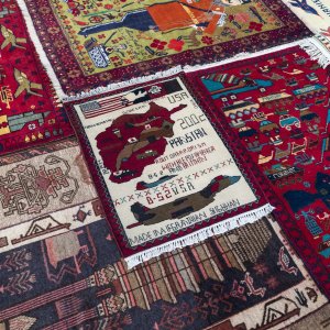 Lungo il percorso espositivo, l’installazione dei War Rug dalle collezioni della Fondazione Sergio Poggianella: i cosiddetti ‘tappeti di guerra’ sono una testimonianza della maestria degli artisti orientali nel narrare la storia anche attraverso oggetti d’uso comune, vere e proprie opere d’arte per la loro valenza estetica, etica e sociale. “Creati in un contesto di guerra – scrive Sergio Poggianella – possono indicare la strada verso una cultura di pace, in cui i confini degli Stati, tema centrale nelle vertenze territoriali, anziché venir profanati, possano essere pacificamente attraversati per esplorare spazi e condividere culture”.