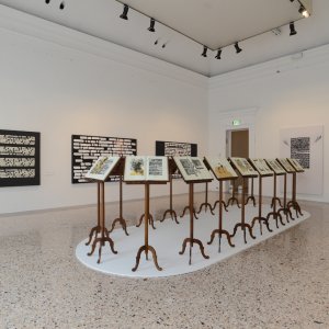 Il segno, nei primi anni Ottanta, da nero si muta in bianco, e al testo scritto spesso si sostituisce un’immagine. Le installazioni L’ora italiana (1985) e La veglia di Bach (1985), ricostruite in mostra, rappresentano la summa di questa ricerca. Una ricerca che ha portato alla realizzazione del ciclo Guglielmo Tell, presentato nella sala personale alla 45° Biennale di Venezia (1993) e ora riallestito a Palazzo Reale. Come focus indispensabile alla comprensione dell’opera dell’artista, sarà riproposta al centro del percorso espositivo di Palazzo Reale l’installazione-partitura per quindici pianoforti Chopin.