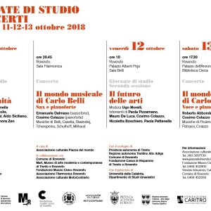 Le tre giornate di Rovereto prevedono anche due concerti serali, giovedì alle 20.45, alla Sala Filarmonica di Rovereto con sax e pianoforte, con Emanuele Dalmaso (sassofono) e Cosimo Colazzo (pianoforte), con musiche dello stesso Carlo Belli, Alfredo Casella, Igor Stavinskij, Alexandre Tcherepnine, Ervin Schulhoff, Darius Milhaud. Il secondo, sabato 13 ottobre 2018 alle 17.30, alla Biblioteca Civica di Rovereto, Palazzo dell’Annona, con voce e pianoforte, con Roberto Abbondanza (baritono) e Cosimo Colazzo (pianoforte), musiche di Francis Poulenc, Maurice Ravel, Goffredo Petrassi, Cosimo Colazzo.