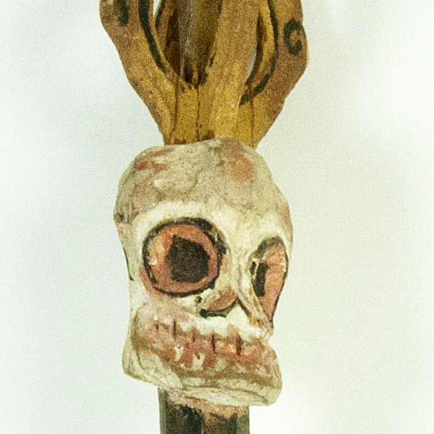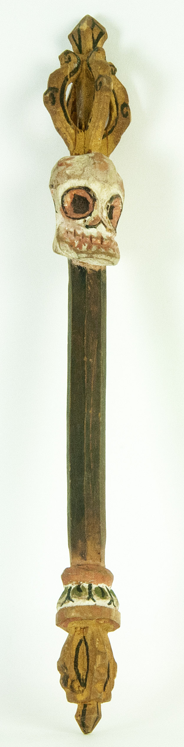 Il terminale superiore presenta quattro punte che si diramano verso i punti cardinali, formando una croce. Simbolicamente, il Vishvavajra rappresenta limmodificabilità assoluta e la base su cui poggia lintero universo spirituale; è il simbolo dellequilibrio perfetto e della protezione multidirezionale. Sotto, il bastone presenta una serie di volumi sovrapposti: un pomello globulare rosso scuro e una sezione a campana rovesciata decorata con petali di loto policromi: questi elementi richiamano la struttura di uno stupa o di un baldacchino rituale, elevando il semplice legno a una dignità architettonica in miniatura. Luso alternato di rosso, verde, giallo e nero segue i canoni del simbolismo cromatico tantrico. Il fusto del bastone è decorato con striature longitudinali verdi e rosse, che comunicano un senso di movimento e vitalità ascendente.