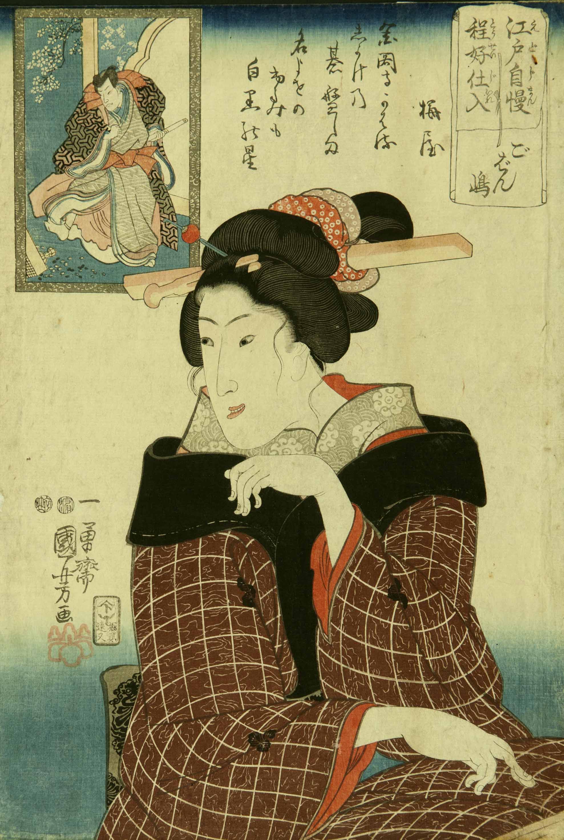 Soggetto: Il foglio appartiene al filone degli Edo meisho bijin, tipico della produzione xilografica della prima metà dellOttocento. Si tratta nello specifico di una bijin-ga (ritratto di bella donna), un genere molto popolare e pubblico che celebrava la bellezza femminile, la moda e le celebrità dellepoca. La donna indossa un raffinato kimono a scacchi marroni e rossi (motivo molto alla moda, chiamato benkei-gima): è una ‘bellezza canonica’, probabilmente una geisha o una cortigiana di alto rango; la posa è pensosa ed elegante.