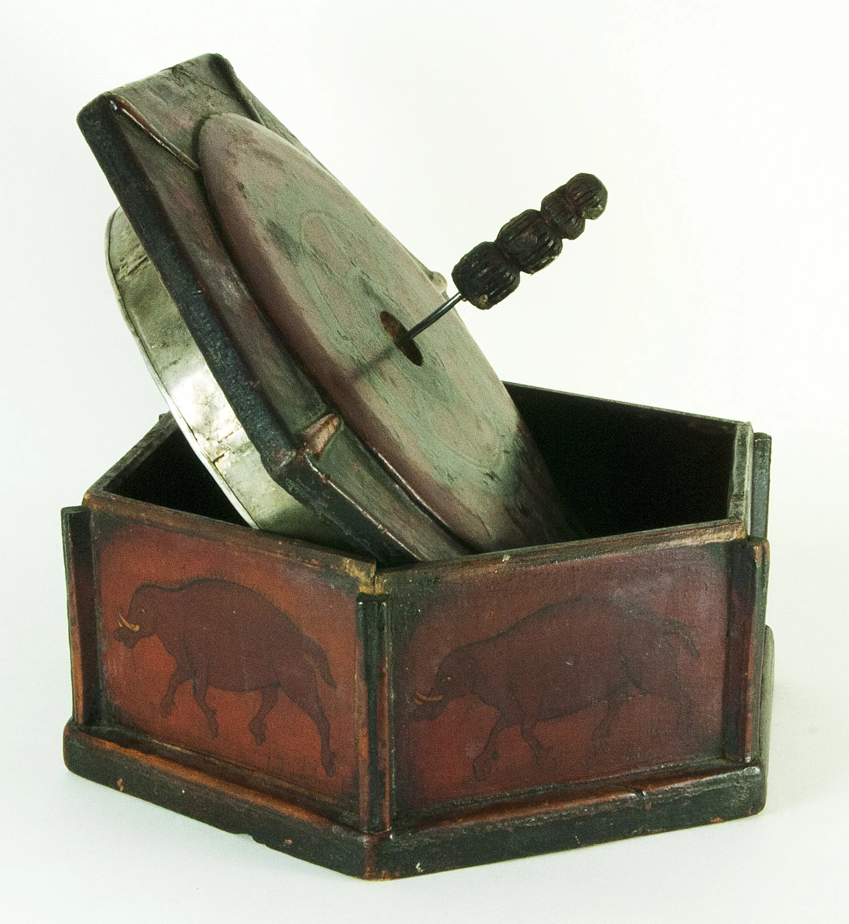 Questa “Ruota della Preghiera” (Mani Khorlo) da tavolo rappresenta un pezzo di eccezionale valore collezionistico e documentario. Il meccanismo attivabile dal perno centrale, il tamburo interno in latta nascosto dal coperchio ligneo e la presenza della Dharmachakra o “Ruota del Dharma” dipinta sul coperchio sono tutti elementi che confermano la natura/funzione di questo oggetto: una più unica che rara tipologia di Mani Khorlo entro custodia esagonale il cui tamburo, anziché essere ‘esposto’, è ‘celato’. La struttura interna in latta è infatti il cuore spirituale dell’oggetto: il cilindro rotante.