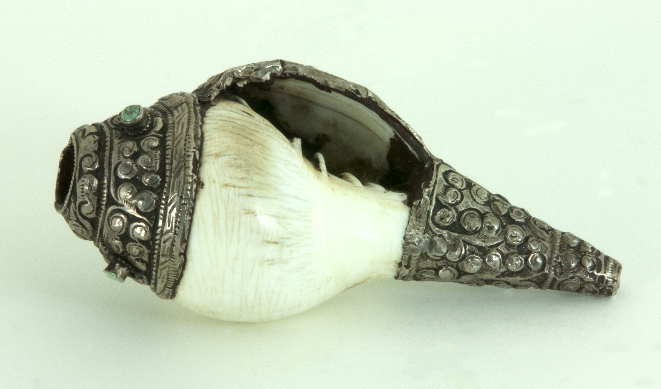 Si tratta del guscio di un gasteropode marino, scientificamente noto come Turbinella pyrum, proveniente dall’Oceano Indiano. Il fatto che si trovi in Mongolia testimonia le vaste reti commerciali che rifornivano i monasteri della steppa. La conchiglia è uno degli Ashtamangala (gli Otto Simboli di Buon Auspicio): rappresenta il suono pervasivo del Buddha che si diffonde in ogni direzione, risvegliando gli esseri dall’ignoranza.