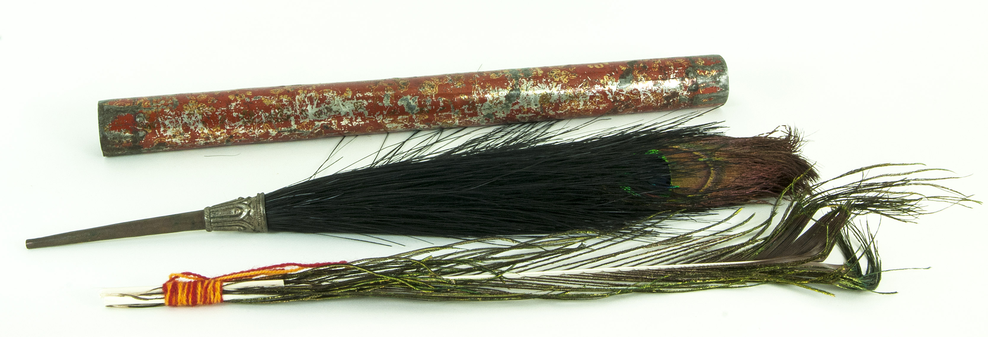 Il pavone è l’animale che transmuta i veleni in bellezza: l’uso di piume naturali in un contesto nomade del XIX secolo richiedeva contenitori rigidi come questo per garantire che lo strumento rimanesse integro durante i trasferimenti tra un monastero e l’altro.