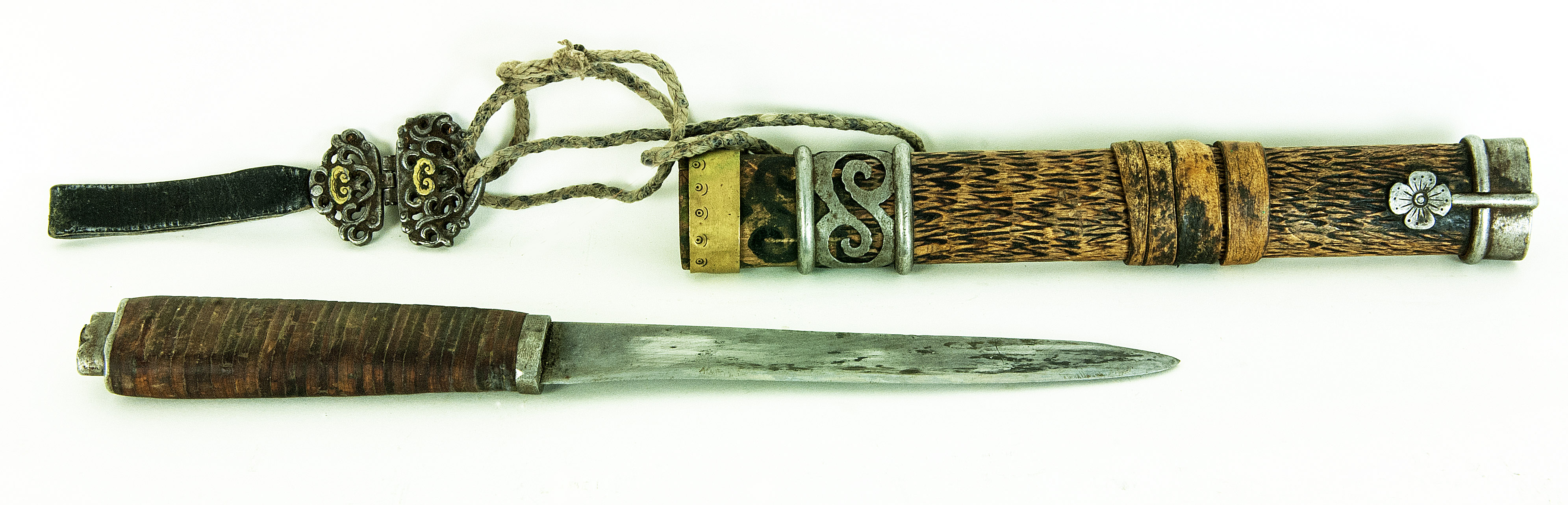 Il fodero è realizzato in un legno venato molto scuro e denso, probabilmente legno di palma o un’essenza esotica importata, caratterizzato da fibre “scheggiate” molto decorative. L’impugnatura è avvolta in sottili strisce di cuoio, tecnica studiata per garantire una presa antiscivolo perfetta, fondamentale nelle temperature estreme della steppa.
