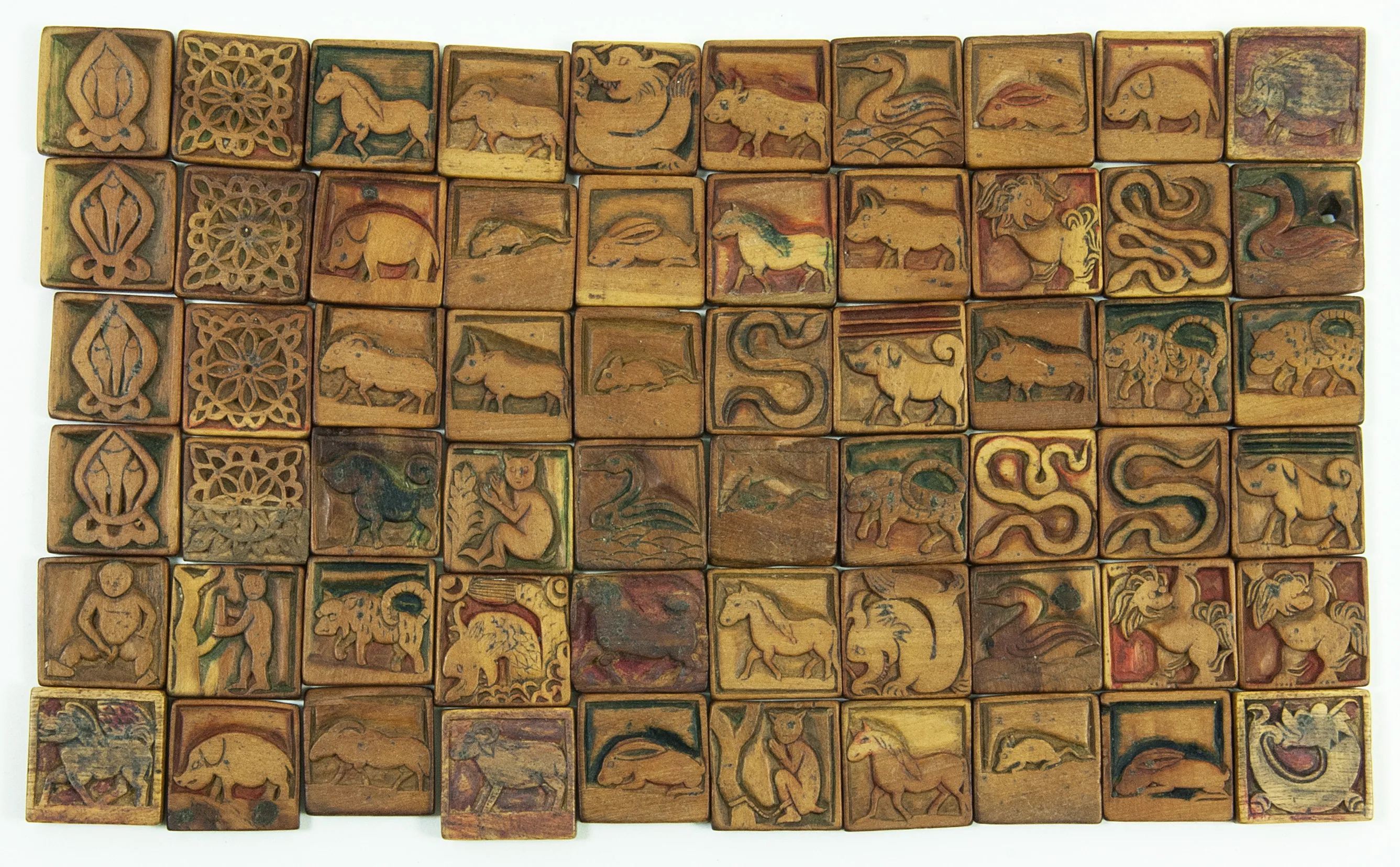 Set completo (60 tessere) del gioco tradizionale Khorol (Хорол), il gioco da tavolo più prestigioso e simbolico della tradizione mongola. Le tessere raffigurano i dodici animali dello zodiaco mongolo, ma seguono una gerarchia rigida che riflette la visione del mondo del XIX secolo.