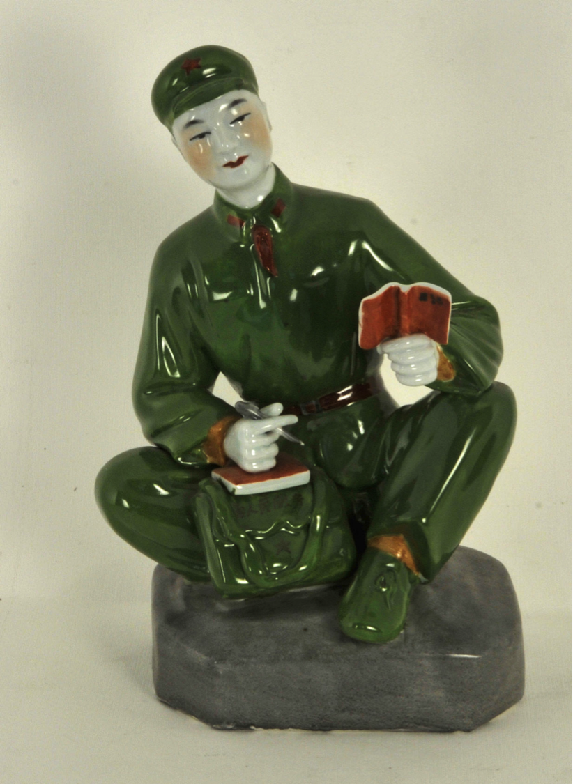 La statuina ritrae un giovane soldato dell’Esercito Popolare di Liberazione (EPL) in un momento di pausa e riflessione. Seduto in posizione rilassata su una base che simula un blocco di pietra grigia. La composizione trasmette un senso di calma e dedizione assoluta. Il soldato tiene con la mano sinistra il Libretto Rosso aperto, mentre con la destra impugna una penna, pronto a trascrivere i propri pensieri o le citazioni del leader sul diario poggiato sulla borsa. L’opera celebra il concetto di “Soldato-Studente”. L’uniforme è completa di stelletta rossa sul berretto e mostrine rosse sul colletto, simboli della fedeltà politica. La borsa con lo slogan “Servire il popolo” ribadisce il mandato etico della figura.