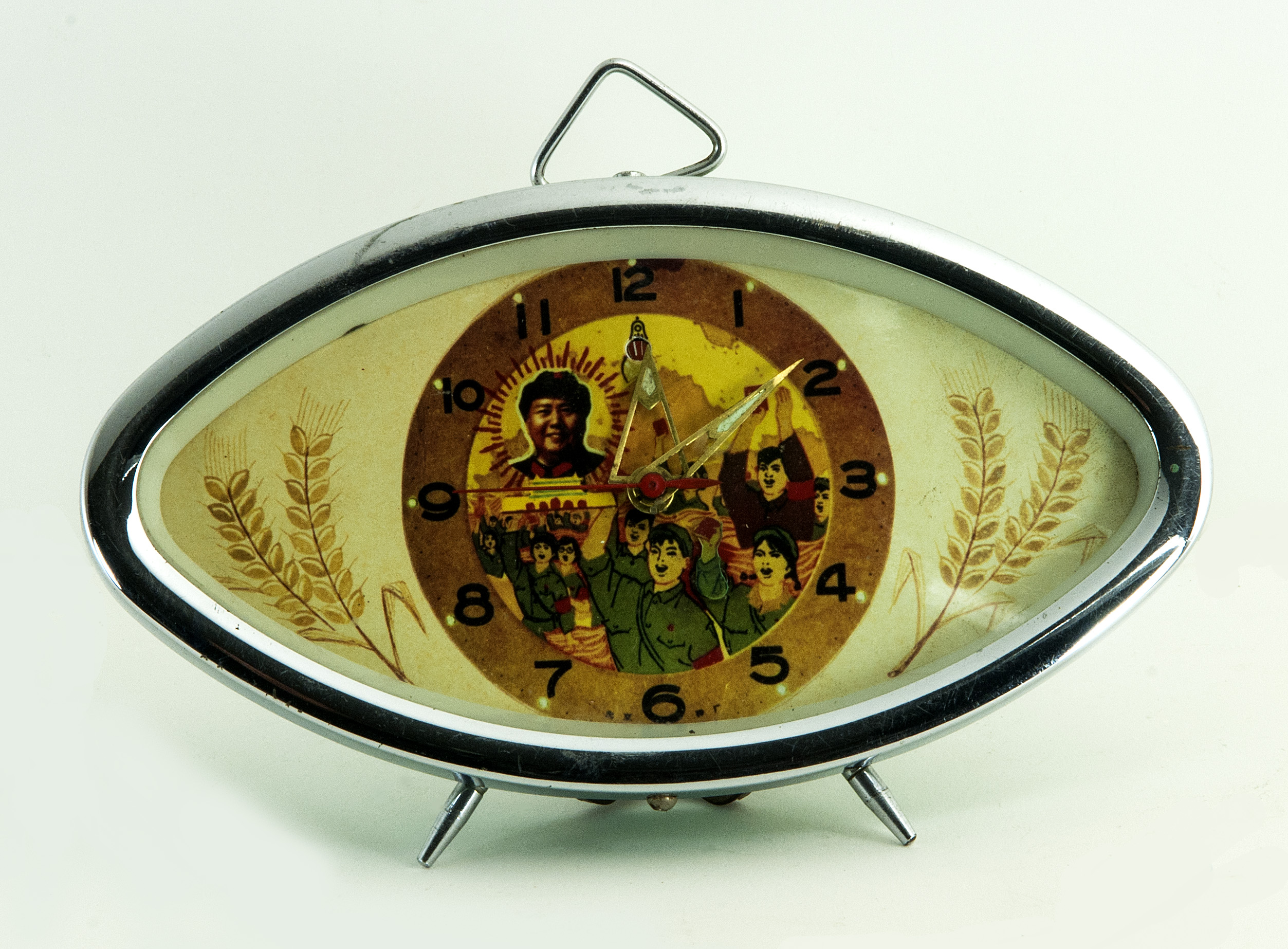Nel quadrante centrale, un ritratto del Presidente Mao Zedong in uniforme militare, circondato da una raggiera solare rossa su fondo giallo; sotto di lui, una folla di giovani rivoluzionari (Guardie Rosse) acclamano verso l’alto tenendo il Libretto Rosso. Sui lati, motivi a spighe di grano che incorniciano il quadrante, legando l’ideologia politica alla prosperità della nazione. Poggia su due piedini metallici inclinati e presenta una maniglia superiore a triangolo, elementi che conferiscono all’oggetto una linea “space-age” adattata alla propaganda maoista.