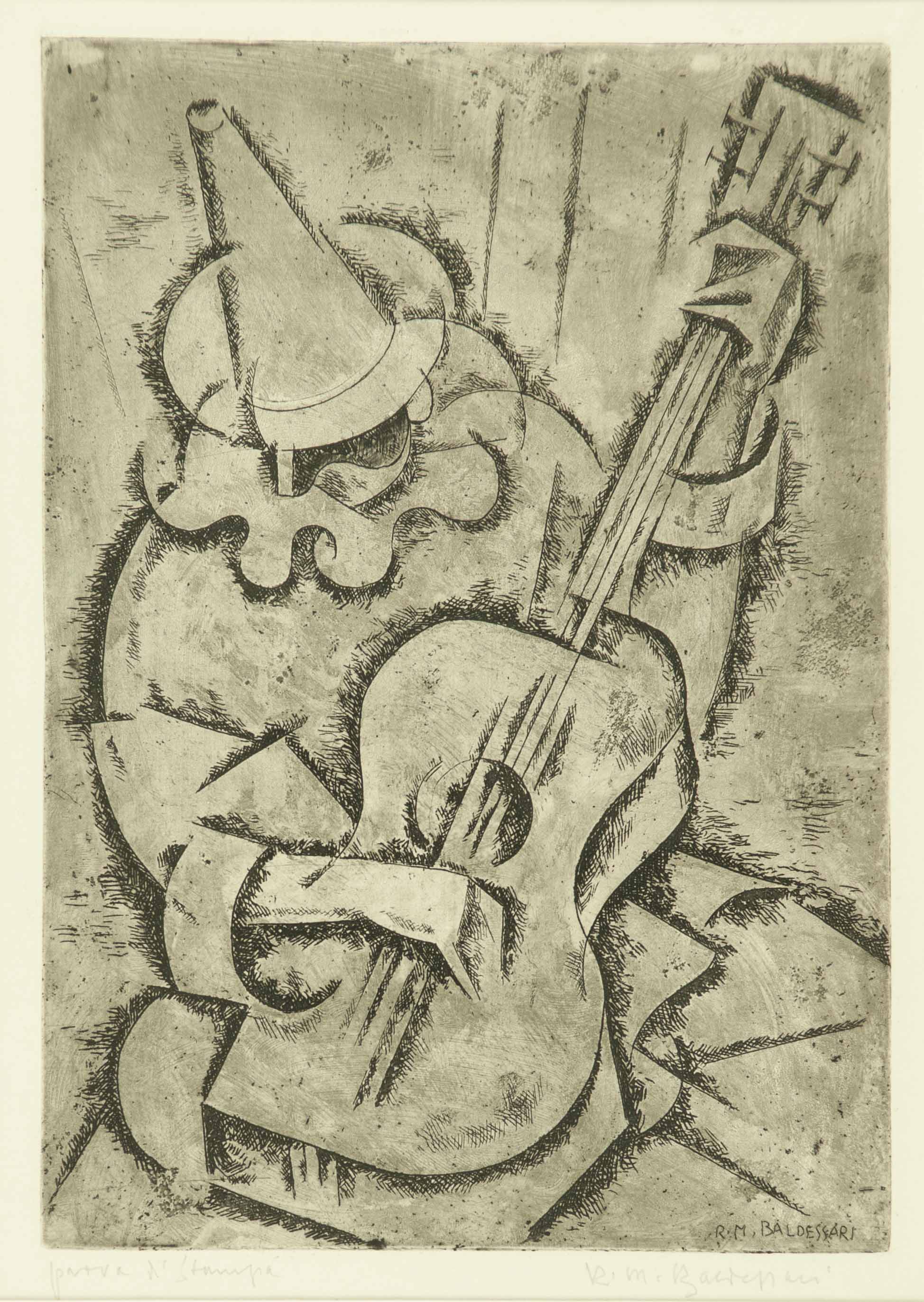 Prova di stampa come indicato a matita in basso a sinistra; firmata “R. M. Baledessari” sia in lastra che fuori lastra.