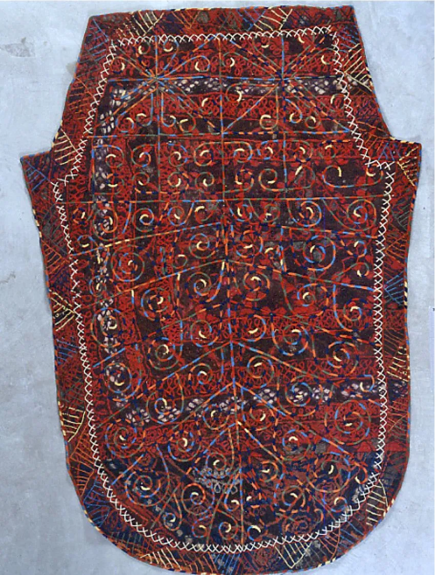 - Lana ovina e pigmenti / Tecnica tradizionale dell'infeltrimento; il feltro è sagomato e interamente ricamato a catenelle