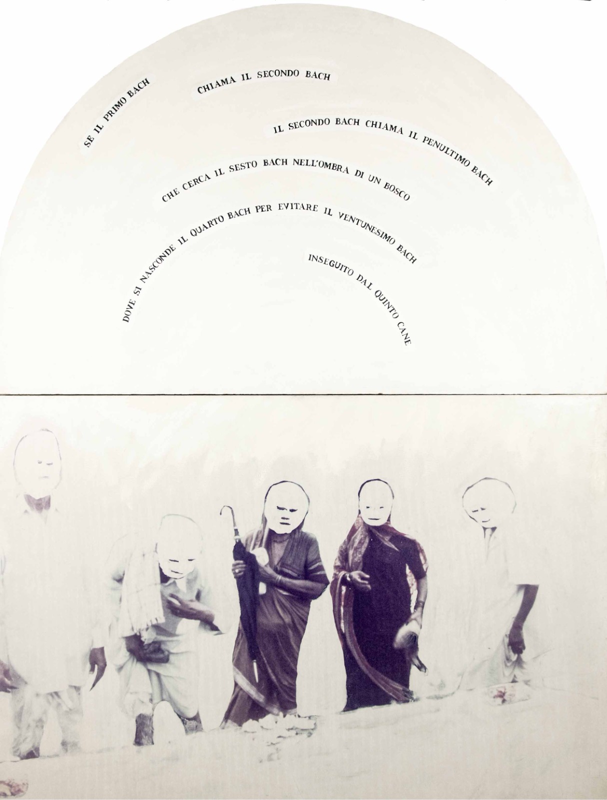 Parte Superiore (Lunetta). Una forma semicircolare che evoca l’abside di una chiesa o il timpano di un tempio. Su una superficie bianca immacolata, il testo è disposto in archi concentrici. Le frasi giocano sulla ripetizione ossessiva del nome “Bach” e di numerazioni progressive (“Se il primo Bach chiama il secondo Bach…”), creando un ritmo visivo che mima la fuga musicale o una litania laica.