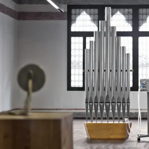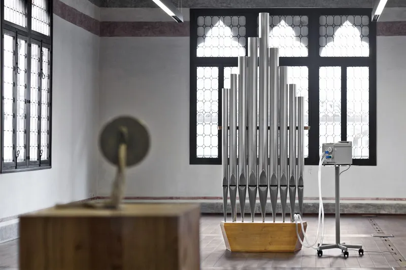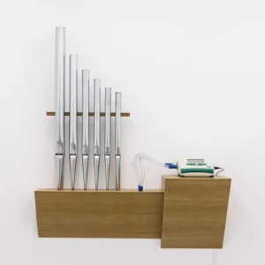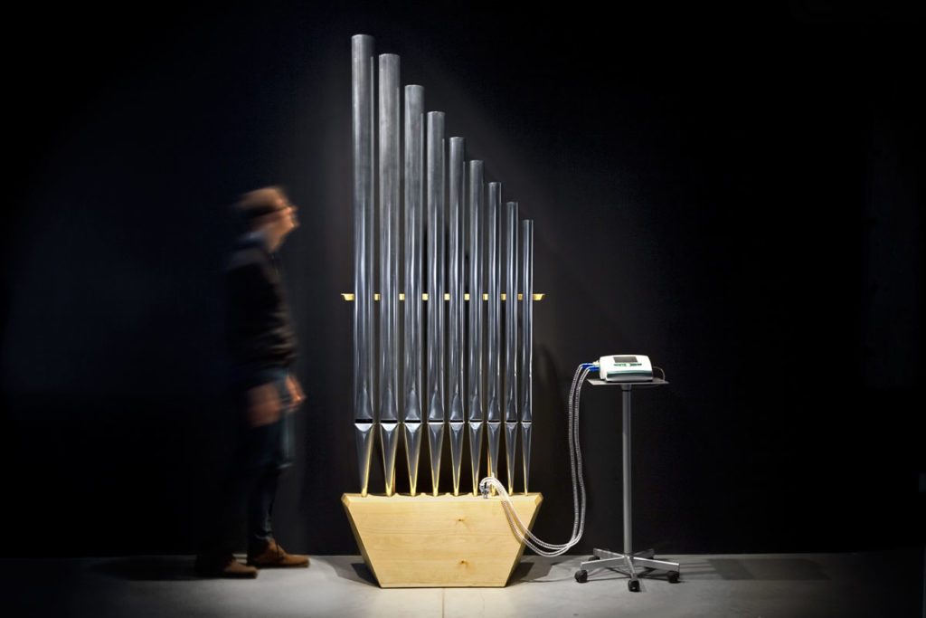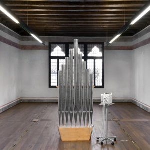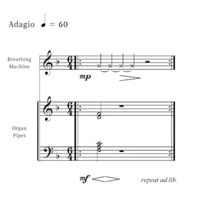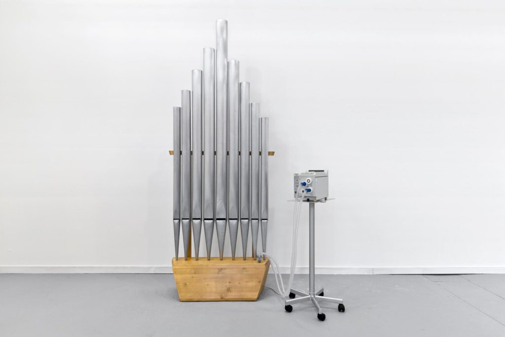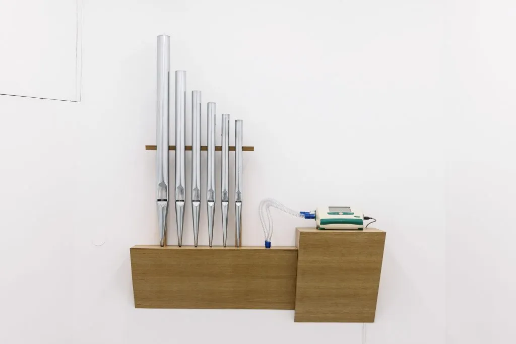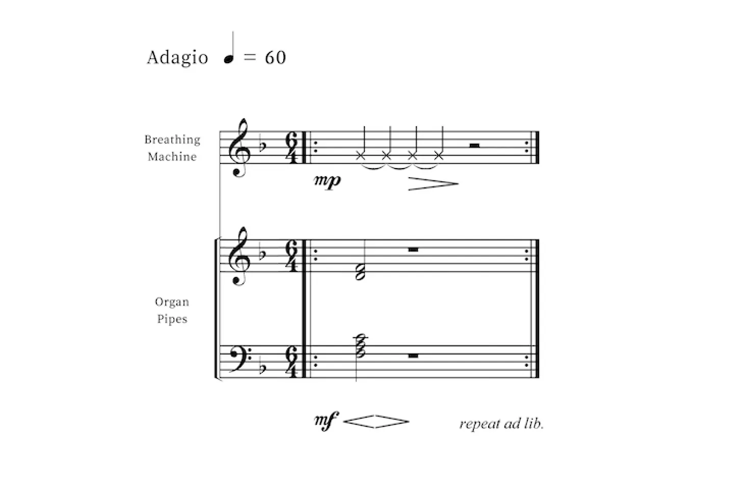 Una macchina medica per la ventilazione polmonare suona un accordo musicale su un organo a canne al ritmo costante del respiro automatico. L’azione di questo organo artificiale genera un cortocircuito di senso che si lega alla volontà e responsabilità di chi avvia – ad libitum – questo requiem meccanico, metafora di un limite che l’uomo delega alla tecnologia.
