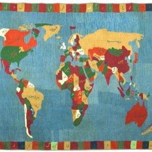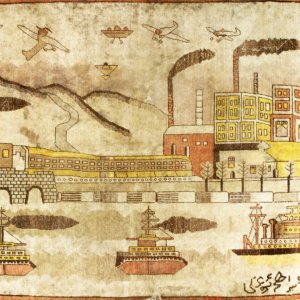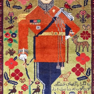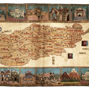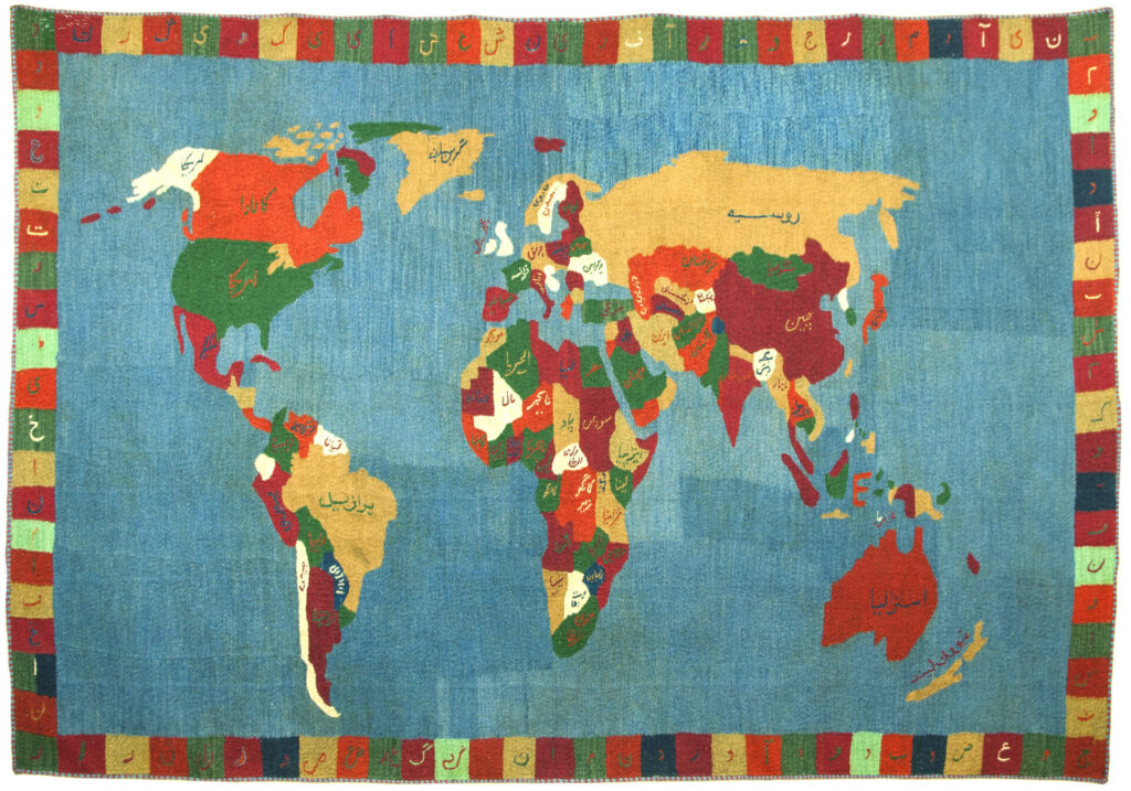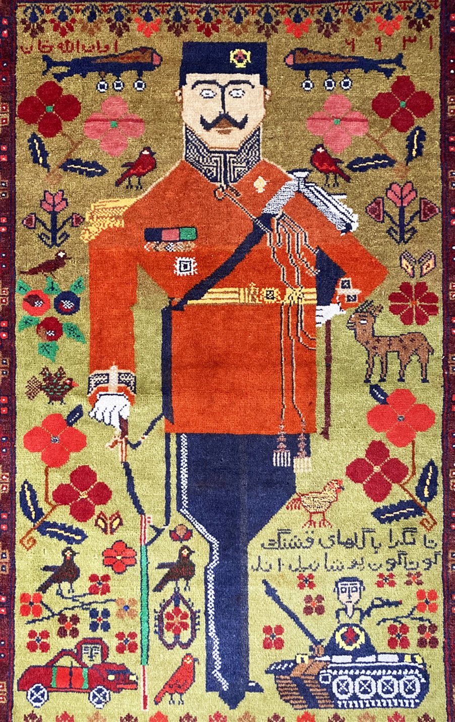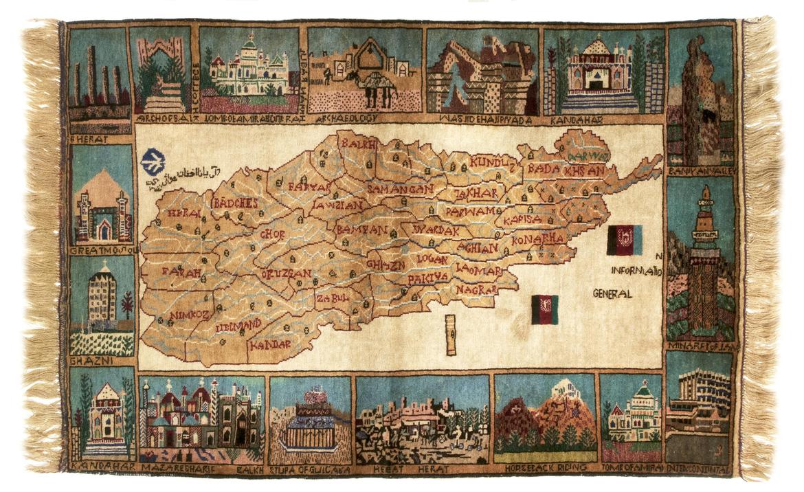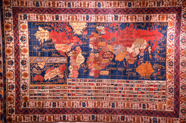 Attingendo alla collezione di duecento esemplari di tappeti figurati orientali (dal fondo di dotazione della Fondazione Sergio Poggianella), si è inteso allestire un percorso che fosse in grado di documentare le numerose varianti dei cosiddetti war rug, i tappeti di guerra afghani, ponendone in evidenza le questioni e le prospettive di ricerca. Prevalentemente annodati e più raramente tessuti o ricamati, questi sono realizzati per la gran parte in Afghanistan (ma anche in Pakistan, alla cui frontiera nord-ovest si erano stanziate le nuove manifatture dei profughi afghani, o in Iran dove ancora oggi si contano circa tre milioni di rifugiati afghani), oltre che in Asia Centrale e in Cina. Tra i loro soggetti, rappresentazioni geografiche del mondo e della regione afghana che vanno da veri e propri planisferi arricchiti dal catalogo delle bandiere degli Stati, alle carte politiche e tematiche, al paesaggio, al ritratto dei personaggi pubblici; con o senza le “armi”. Sono manufatti che hanno goduto della massima fortuna, ovvero di un significativo interesse commerciale, nel periodo compreso tra l’invasione sovietica dell’Afghanistan (1979-1989) e la missione Enduring Freedom (2001-2006), ben oltre i confini dello stesso Afghanistan. La loro origine rimane però ancora tutta da indagare, costituendo tale produzione un esempio di drastica rottura con la tradizione del tappeto orientale; basti pensare che già negli anni Venti, nel vicino Khotan, nella trama dei tappeti si insidiavano i primi segni della rivoluzione modernista, comparendo nei paesaggi urbani i treni in velocità, le navi a vapore e gli aeromobili.