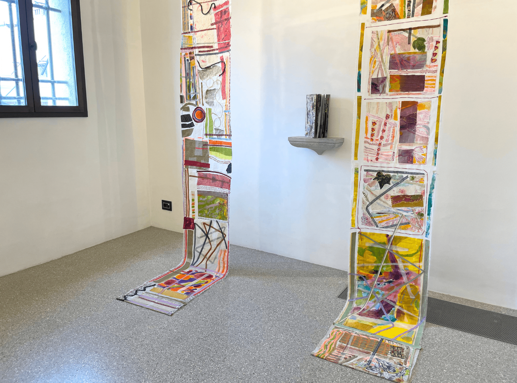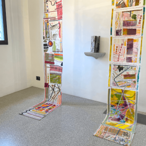 Sempre al secondo piano è presente anche Tessere la pace di Olimpia Biasi. L’opera restituisce in forma visiva il tema della crisi come cambiamento. Realizzato in collages polimaterici su garza, questo lavoro rappresenta una tessitura che cerca idealmente di tracciare un percorso per ricomporre relazioni e rimarginare ferite.