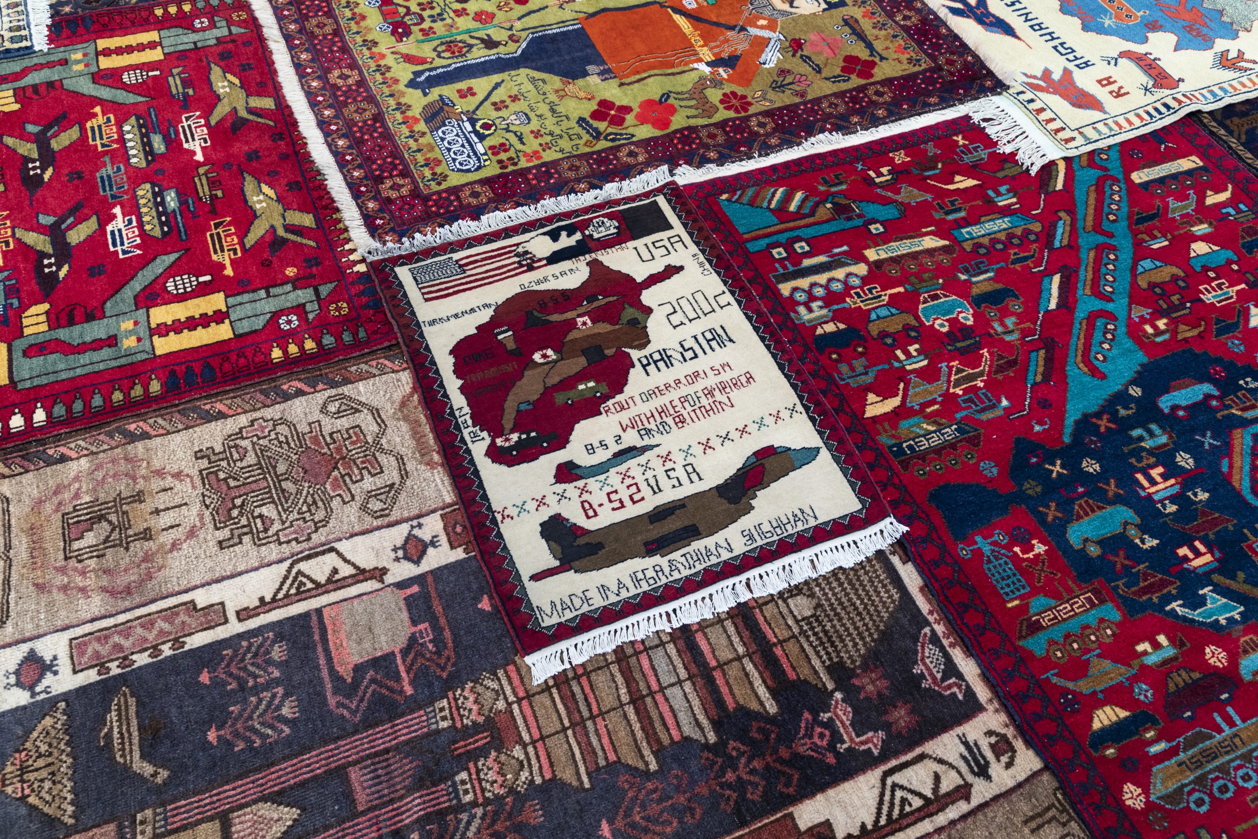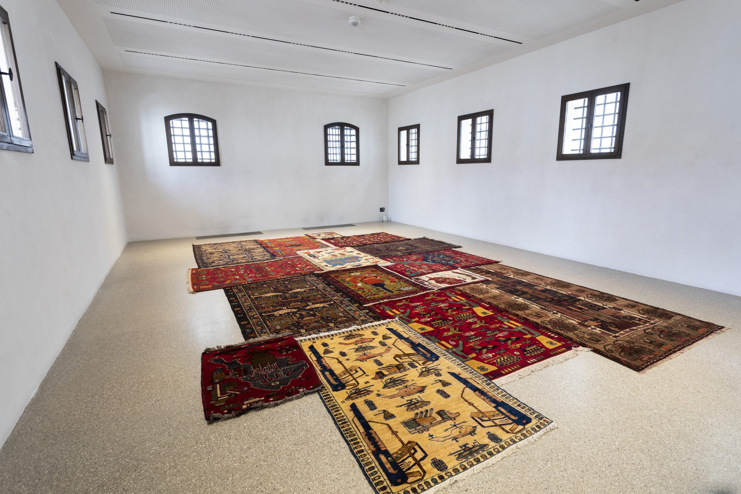 Lungo il percorso espositivo, l’installazione dei War Rug dalle collezioni della Fondazione Sergio Poggianella: i cosiddetti ‘tappeti di guerra’ sono una testimonianza della maestria degli artisti orientali nel narrare la storia anche attraverso oggetti d’uso comune, vere e proprie opere d’arte per la loro valenza estetica, etica e sociale. “Creati in un contesto di guerra – scrive Sergio Poggianella – possono indicare la strada verso una cultura di pace, in cui i confini degli Stati, tema centrale nelle vertenze territoriali, anziché venir profanati, possano essere pacificamente attraversati per esplorare spazi e condividere culture”.