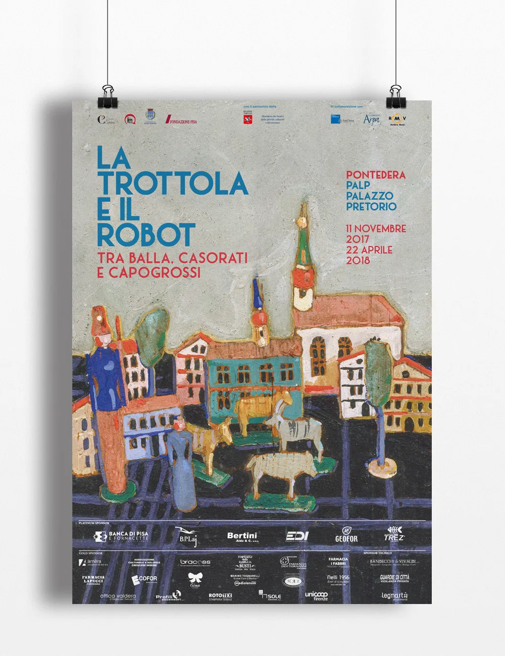 La grande mostra “La trottola e il robot. Tra Balla, Casorati e Capogrossi” al Palazzo Pretorio di Pontedera – prodotta dalla Fondazione Pontedera per la Cultura e curata da Daniela Fonti e Filippo Bacci di Capaci – è promossa dalla Fondazione per la Cultura Pontedera, dal Comune di Pontedera e dalla Fondazione Pisa, in collaborazione con l’Istituto di Biorobotica della Scuola Superiore Sant’Anna di Pisa e con il patrocinio della Regione Toscana e del Ministero dei beni e delle attività culturali e del turismo.
