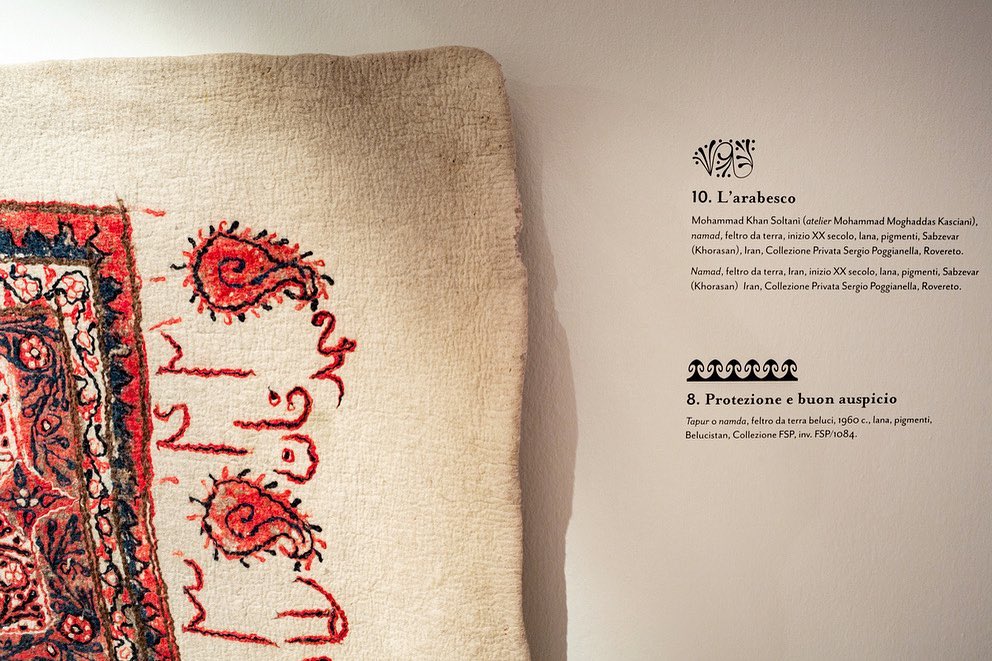 Allestita nello Spazio Cielo al terzo piano di Villa Malpensata e curata da Imogen Heitmann, l’esposizione «Namad», offre al visitatore l’occasione unica di scoprire sedici opere di grandi dimensioni, tra feltri, tessuti ricamati ed elementi di tenda tradizionale (iurta): tutte testimonianze di quanto il feltro sia stato di fondamentale importanza per la vita delle popolazioni dell’Iran e dell’Asia centrale. Le opere esposte sono state selezionate tra quelle raccolte da Sergio Poggianella, gallerista ed esperto d’arte, nonché Presidente della omonima Fondazione di Rovereto; quaranta dei suoi feltri appartengono ora alle collezioni permanenti del MUSEC.