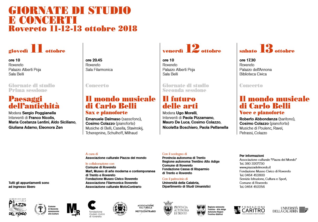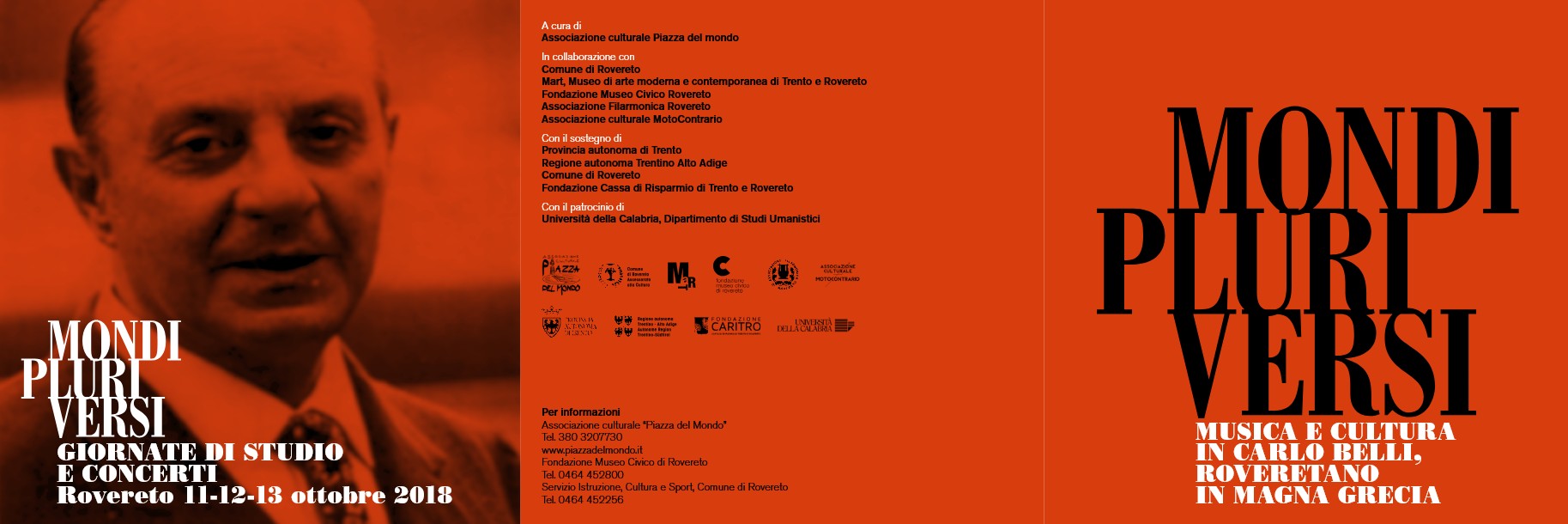 #Talk. Tre giornate di studio da giovedì 11 a sabato 13 ottobre, organizzate dall’associazione culturale “Piazza del Mondo”, per rendere omaggio al grande intellettuale: “Mondi pluriversi. Musica e cultura in Carlo Belli, roveretano in Magna Grecia”. Tra i relatori Sergio Poggianella, la cui Fondazione possiede un cospicuo e articolato “Fondo Carlo Belli”, oggi depositato presso la Fondazione Museo Civico di Rovereto.